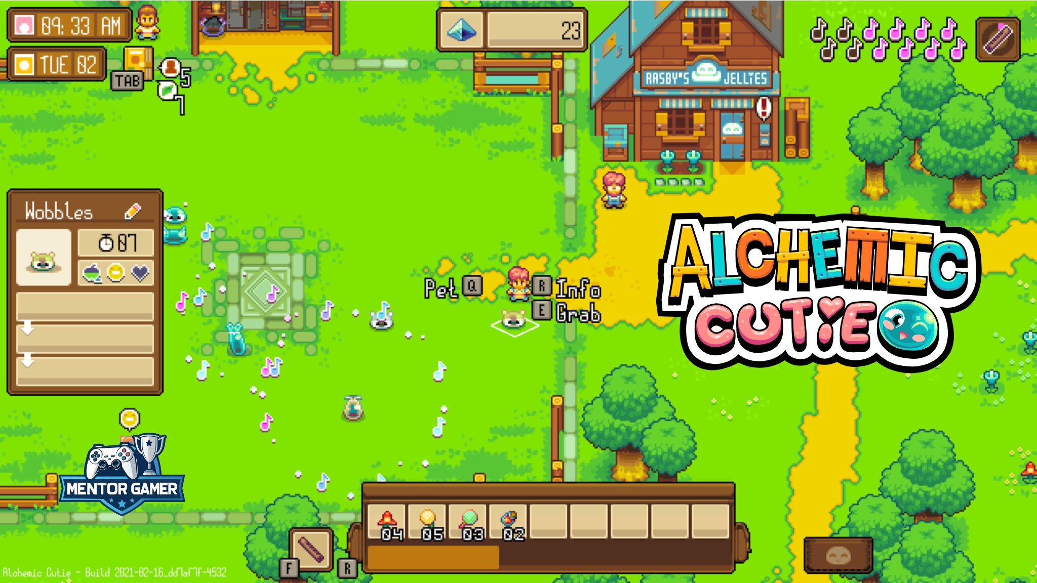 O jogo começa com tutoriais para te mostrar o que pode ser feito. Então o básico você aprende rápido. E aí começa um grande problema. Após o tutorial, você é “jogado” num mundo aberto cheio de itens, personagens, lugares etc. Disse que você é “jogado” porque não tem outras informações sobre os itens, personagens, lugares e assim por diante. Você vai ter que entender tudo sozinho, visto que existem muitas possibilidades do que fazer, muitas informações na tela, muitas variações de resultados do que fazer. Alchemic Cutie se vangloria de ter 4.000 combinações possíveis de gelatinas, que são os bichinhos do jogo. Isso até poderia ser bom, se fosse inserido aos poucos, dando tempo ao jogador para se familiarizar com o básico primeiro.